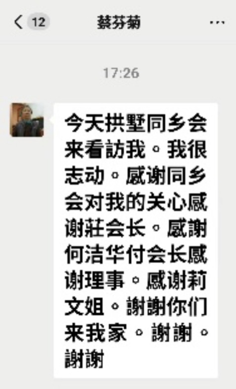 拱墅同鄉會鄉親情濃,關愛老輩。感謝理事會多年盡心盡力令會員深感同鄉手足情。關愛小組到訪將我家令我深感愛的真善美。我已90高齡,祝鄉親們2026平安,喜樂健康!